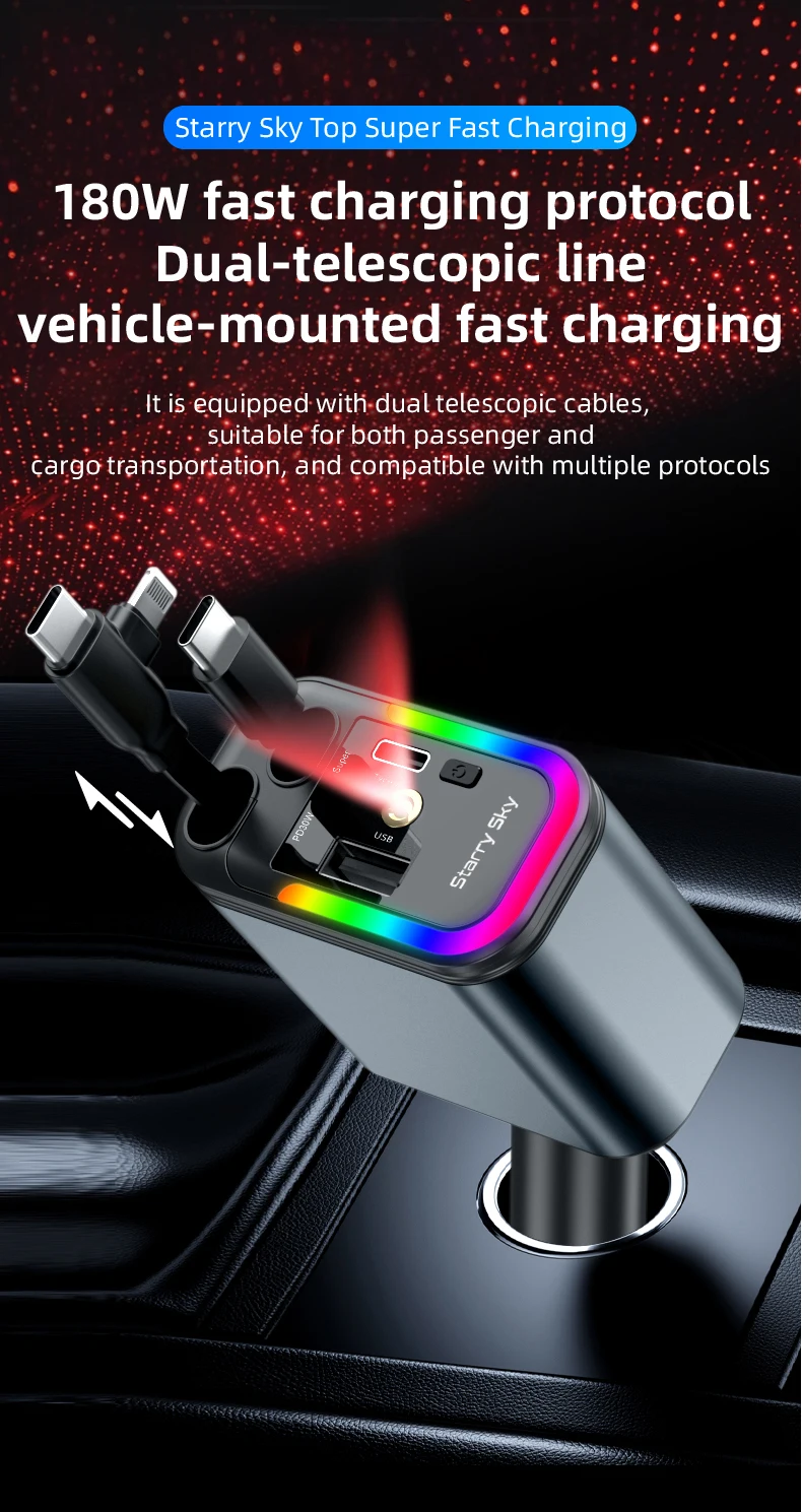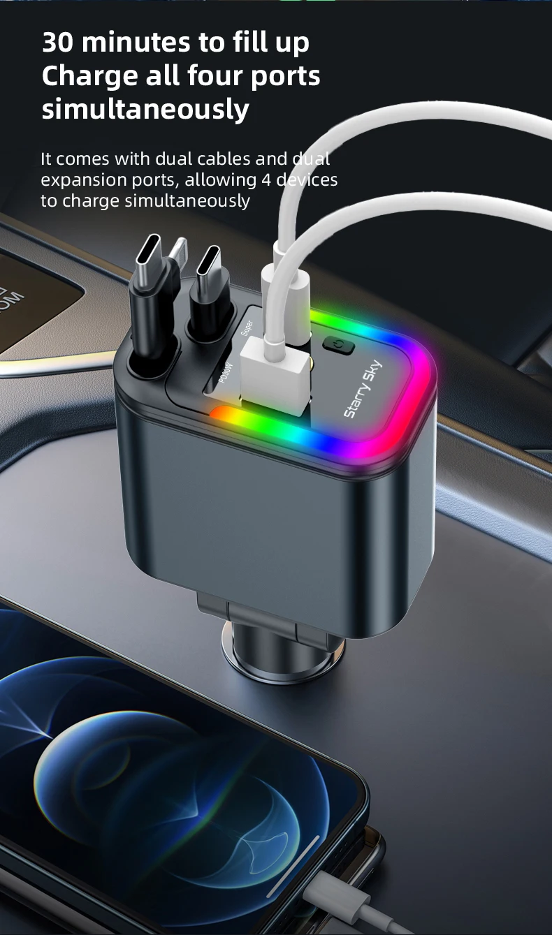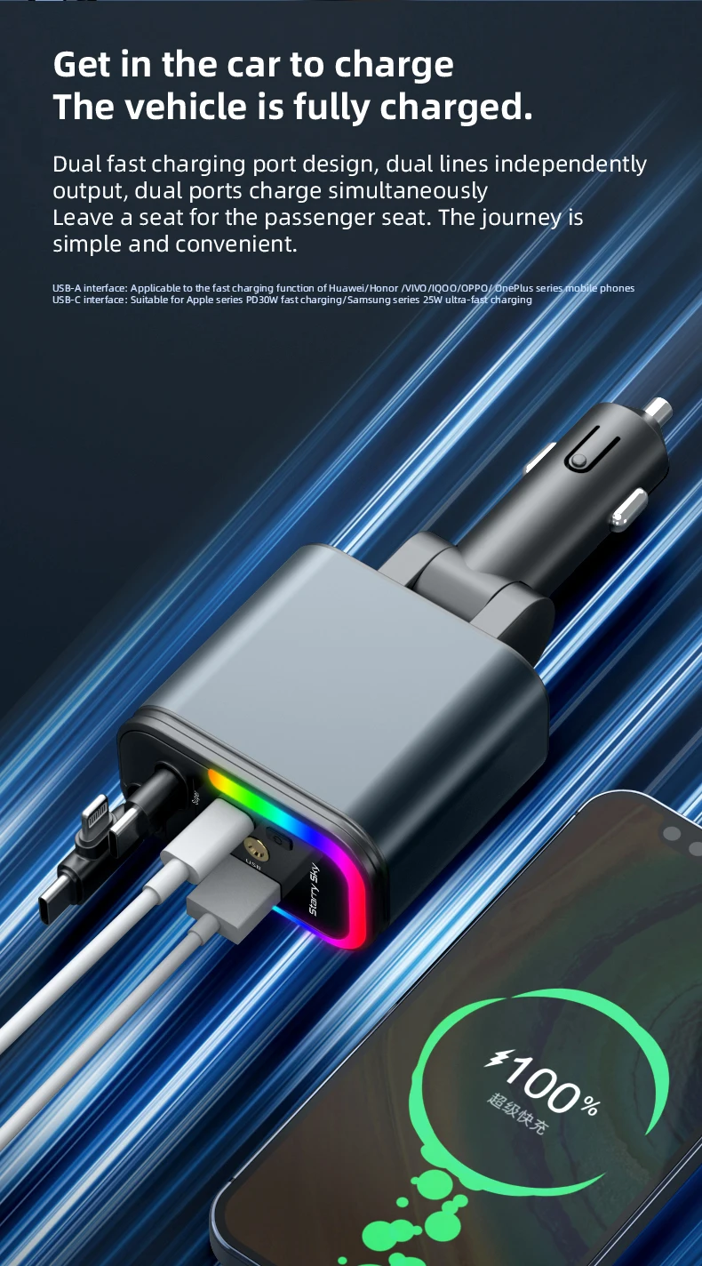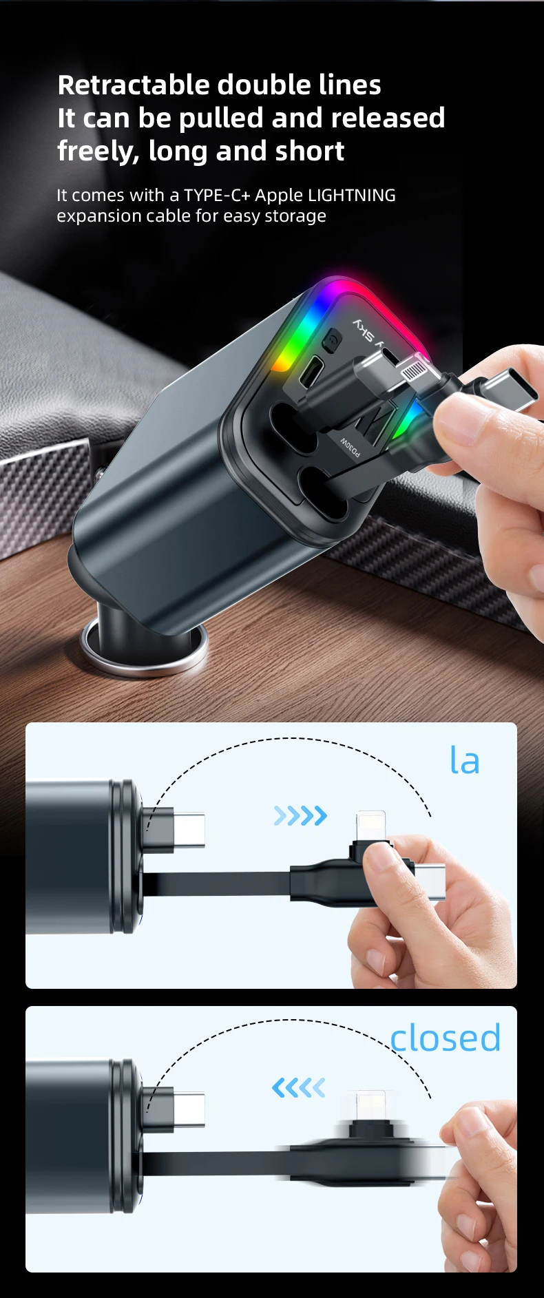 Possui cabos Type-C e Apple Lightning integrados (80 cm de comprimento) que se retraem suavemente com um simples puxão.Este design inteligente elimina fios bagunçados que bagunçam seu carro, mantém os cabos organizados quando não estiverem em uso e facilita o armazenamento.Chega de cabos emaranhados para lidar.