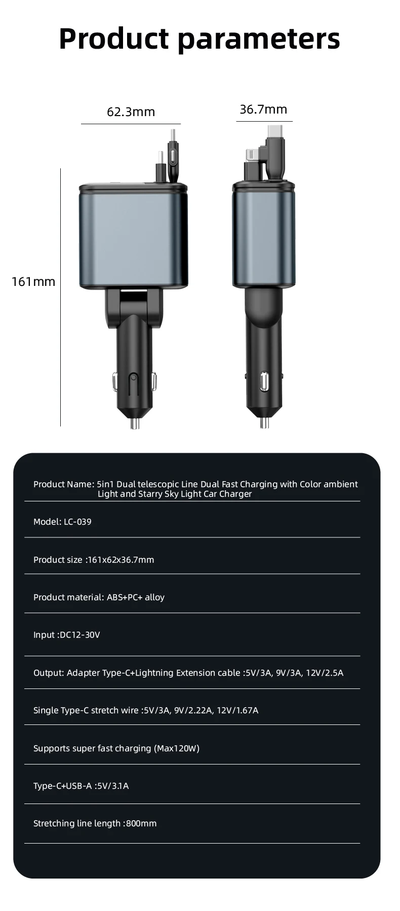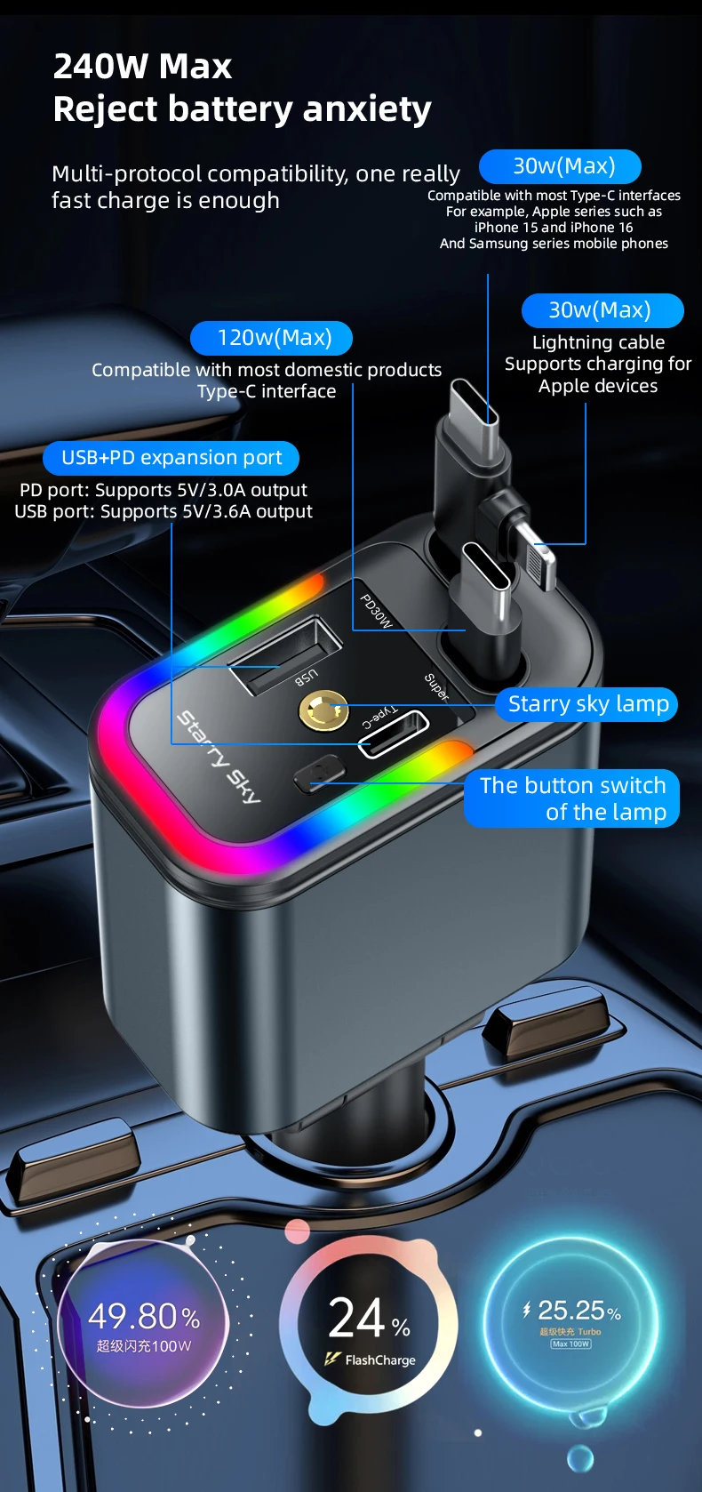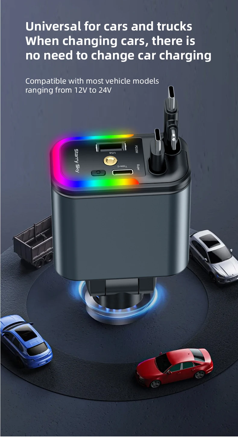 Possui cabos Type-C e Apple Lightning integrados (80 cm de comprimento) que se retraem suavemente com um simples puxão.Este design inteligente elimina fios bagunçados que bagunçam seu carro, mantém os cabos organizados quando não estiverem em uso e facilita o armazenamento.Chega de cabos emaranhados para lidar.