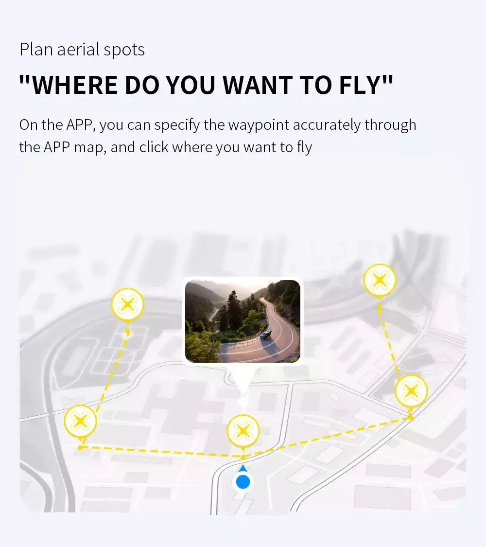 - Modo de voo Waypoint. Abra o APP do drone, use o plano de voo na ponta dos dedos, basta desenhar uma rota na tela, o helicóptero voará automaticamente de acordo com o caminho determinado.
