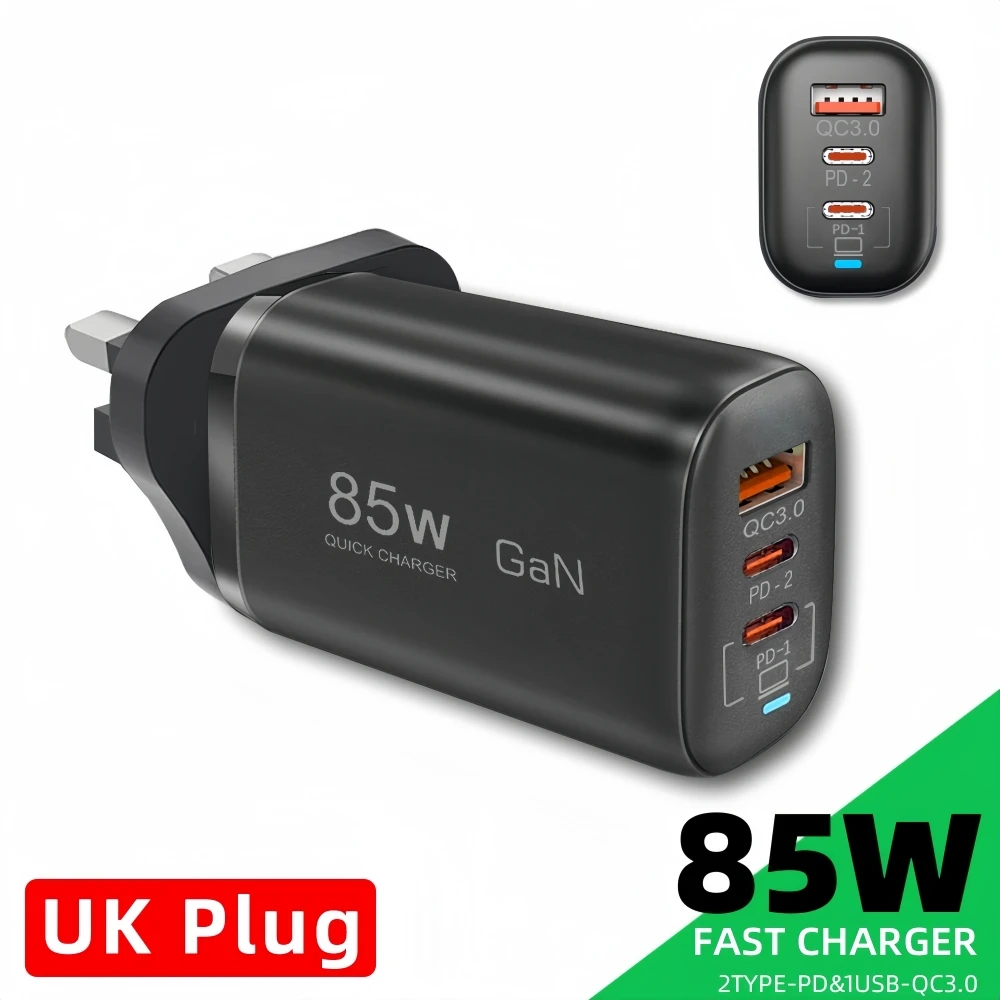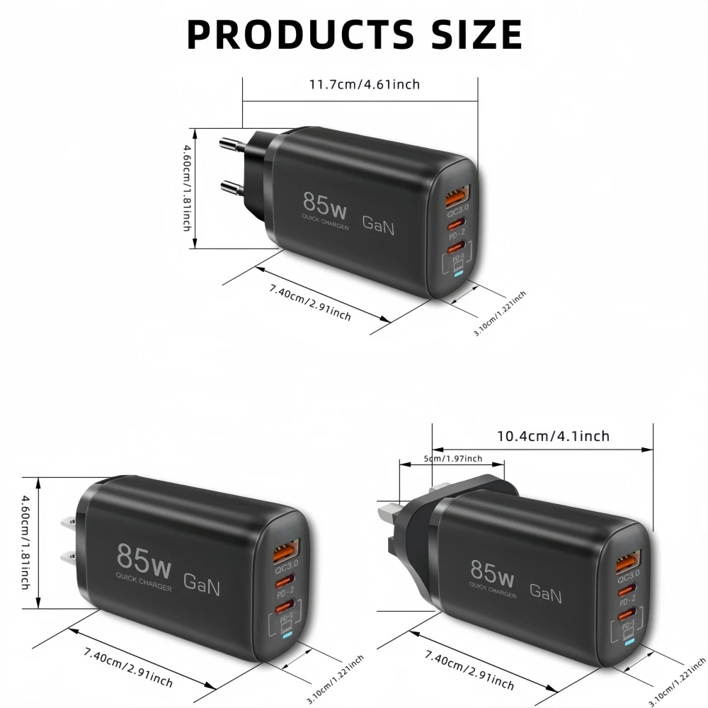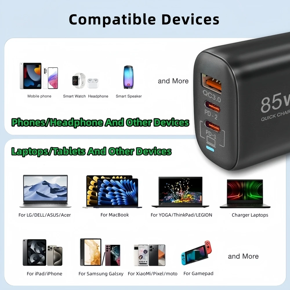 • Quick Charger 85W: Charges your devices quickly and efficiently with a maximum output power of 85W.