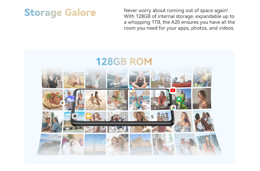 Never worry about running out of space again! With 128GB of internal storage, expandable up to a whopping 1TB, the A20 ensures you have all the room you need for your apps, photos, and videos.