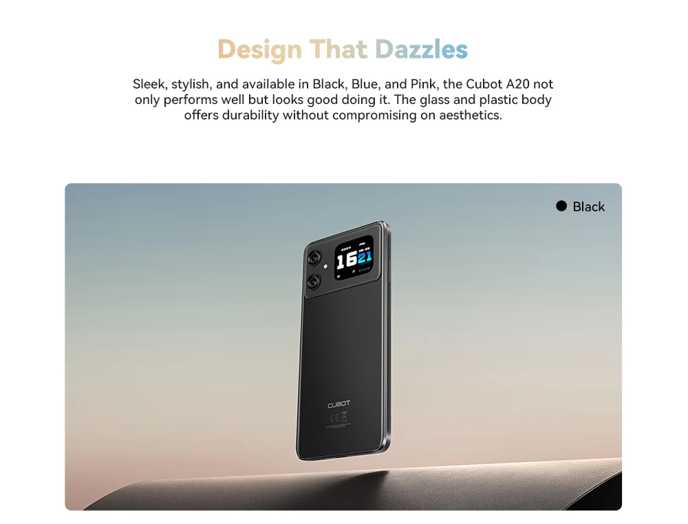 Sleek, stylish, and available in Black, Blue, and Pink, the Cubot A20 not only performs well but looks good doing it. The glass and plastic body offers durability without compromising on aesthetics.