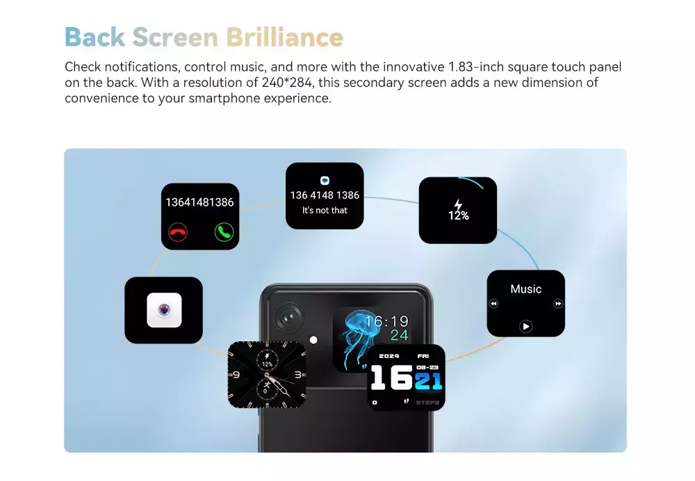 Check notifications, control music, and more with the innovative 1.83-inch square touch panel on the back. With a resolution of 240*284, this secondary screen adds a new dimension of convenience to your smartphone experience.