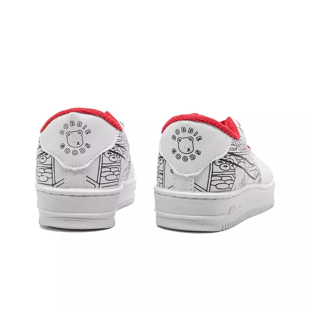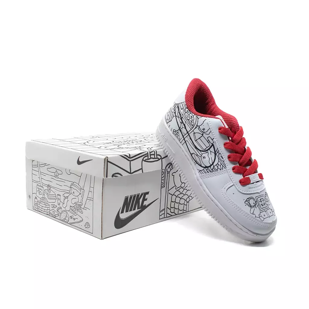 O NK Air Joy Creative apresenta cabedal em material sintético branco com estampas exclusivas em preto que contam histórias mágicas, enquanto detalhes em vermelho agregam um contraste vibrante e moderno. Ideal para o dia a dia, oferece conforto superior para horas de brincadeiras e aventuras, sem abrir mão da diversão visual.